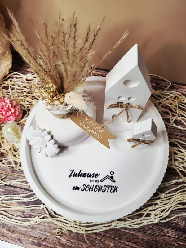 Dieses schönes Dekoration besteht aus runden Keramik Tablett mit eine keramik Vase und 2 kleine Häuschen.