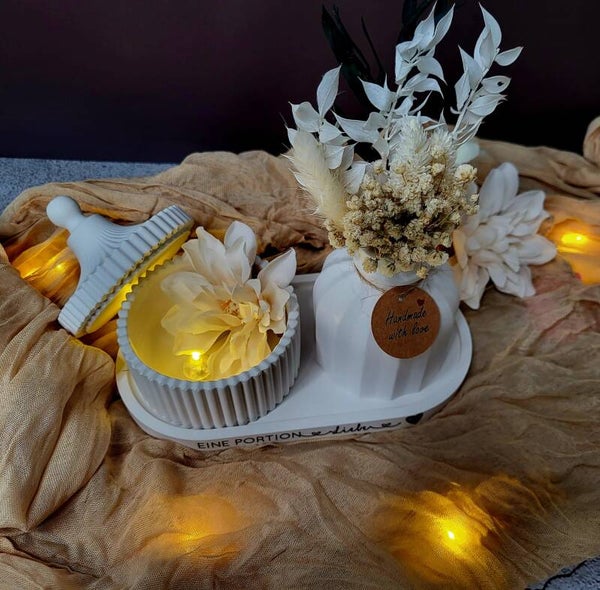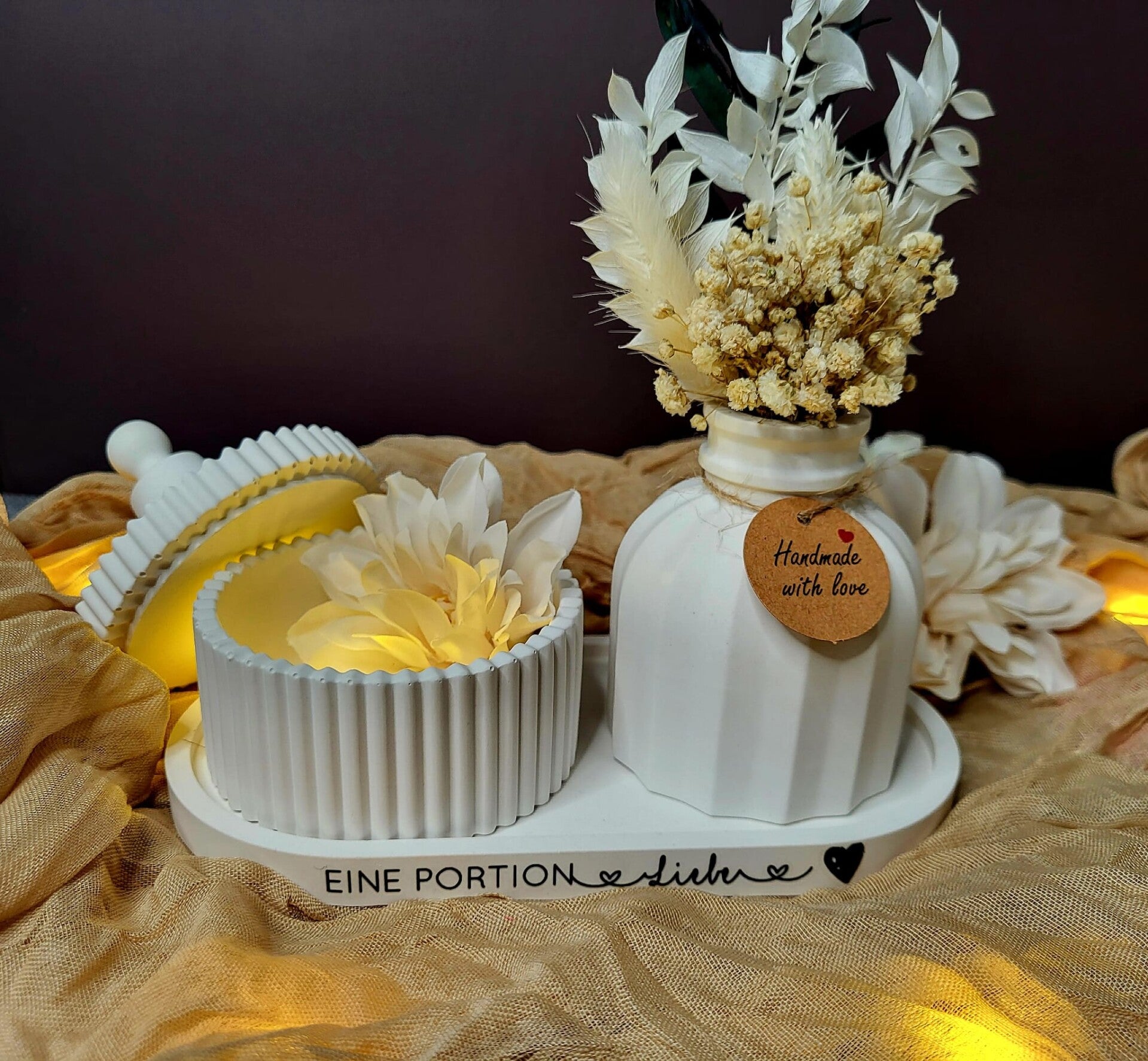 Das wunderschönes Deko besteht aus Keramik Tablet, eine Vase mit Trockenblumen und eine kleine Schmuck Aufbewahrung.